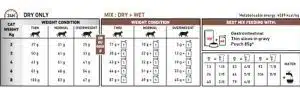 برای استفاده از غذای گربه گاسترو اینتستینال مدریت رویال کنین، مقدار مصرف باید با توجه به وزن گربه تعیین شود. در ادامه، جدول مربوط به مقدار مصرف بر اساس وزن گربه ارائه شده است: