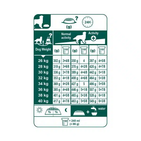 | ۳۰ کیلوگرم | ۳۳۶ گرم (۳ + ۷/۸ فنجان) | ۳۹۰ گرم (۴ + ۴/۸ فنجان) | ۴۴۳ گرم (۵ + ۱/۸ فنجان) |