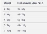 در جدول زیر، میزان و مقدار مناسب این غذا بر حسب وزن و سن گربه بالغ آورده شده است. این دستورالعمل نمونهای از دستورالعملهای ثبت شده روی بسته محصول است: