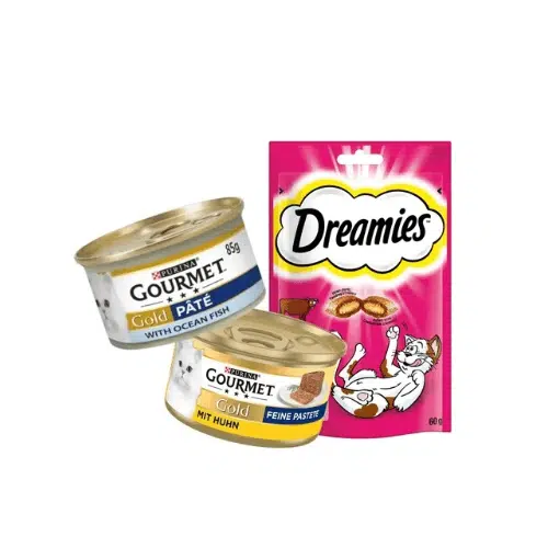 خوشمزه جات گربه ( ۲ عدد کنسرو گورمت + ۱ بسته دریمیز )
