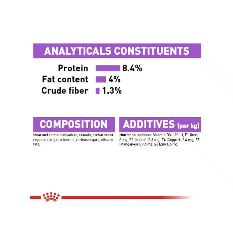 پس از عقیم شدن، متابولیسم بدن سگ ها کاهش و اشتهای آنها افزایش میابد؛ به همین دلیل آنها دچار اضافه وزن می شوند. پوچ سگ عقیم شده رویال کنین، در مقایسه با سایر وعده های غذایی استاندارد سگ ۱۴ درصد کالری کمتری دارد و از اضافه وزن سگ جلوگیری می کند.